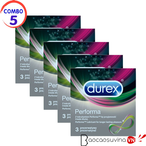 Kéo dài thời gian quan hệ: Bao cao su Durex Performa có chứa 5% benzocaine nằm phía trong của mặt bao, giúp kéo dài thời gian quan hệ, chống xuất tinh sớm, giúp quý ông có thêm những giây phút mặn nồng để chiều chuộng người tình.Bạn gái sẽ phải ngạc nhiên về phong độ của bạn mà không hề biết bí quyết chính ở chiếc bao cao su, và tất nhiên, đừng bật mí cho nàng biết nhé.