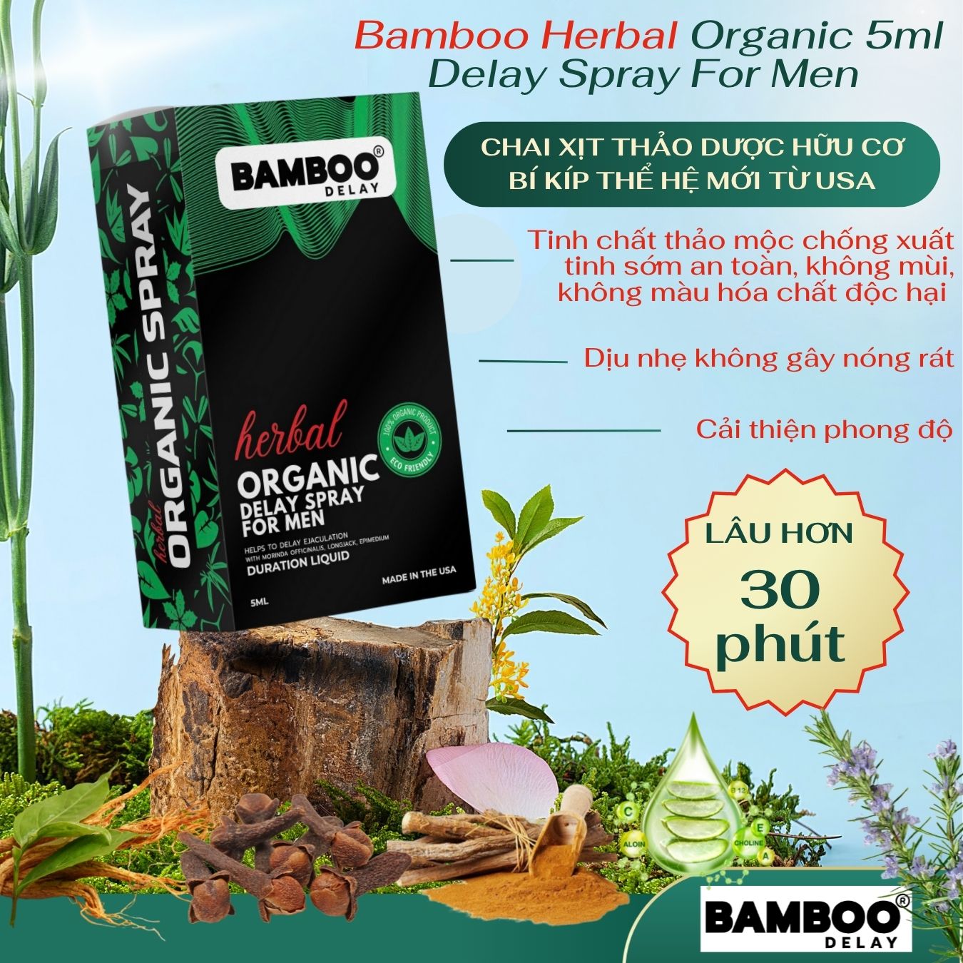 Chai xịt Bamboo HerbalOrganic 5ml, với công thức mới độc quyền từ nguyên bản thiên nhiên giúp kéo dài thời gian 1 cách rất nhanh chóng sau 3 phút, giúp cậu nhỏ tê nhẹ nhàng, để lại 1 lớp tinh dầu mềm dịu da, không bị buốt, giúp kéo dài hiệu quả lên đến hơn 30 phút mà không ảnh hưởng đến sự cương cứng của dương vật trên mọi cơ địa, điều này là sự khác biệt của sản phẩm trên thị trường.